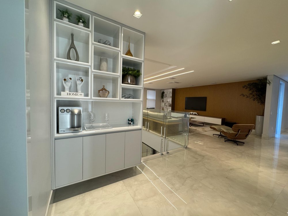 No interior, os acabamentos refletem a excelência: esquadrias de alumínio de alto padrão, bancadas e ilhas em mármores nobres como Quartzito, Branco Paraná, Nero e Nanoglass, além de marcenaria planejada sofisticada e revestimentos em porcelanato de luxo.